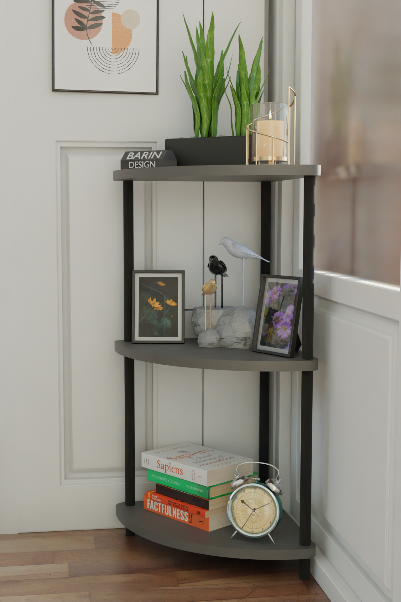 Çevirmeli Kurulum 3 Katlı Dekoratif Köşe Rafı Kitaplık Organizer Aksesuar Düzenleyici Raf Ünitesi Antrasit