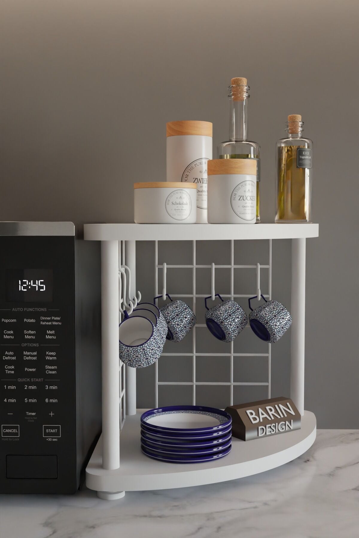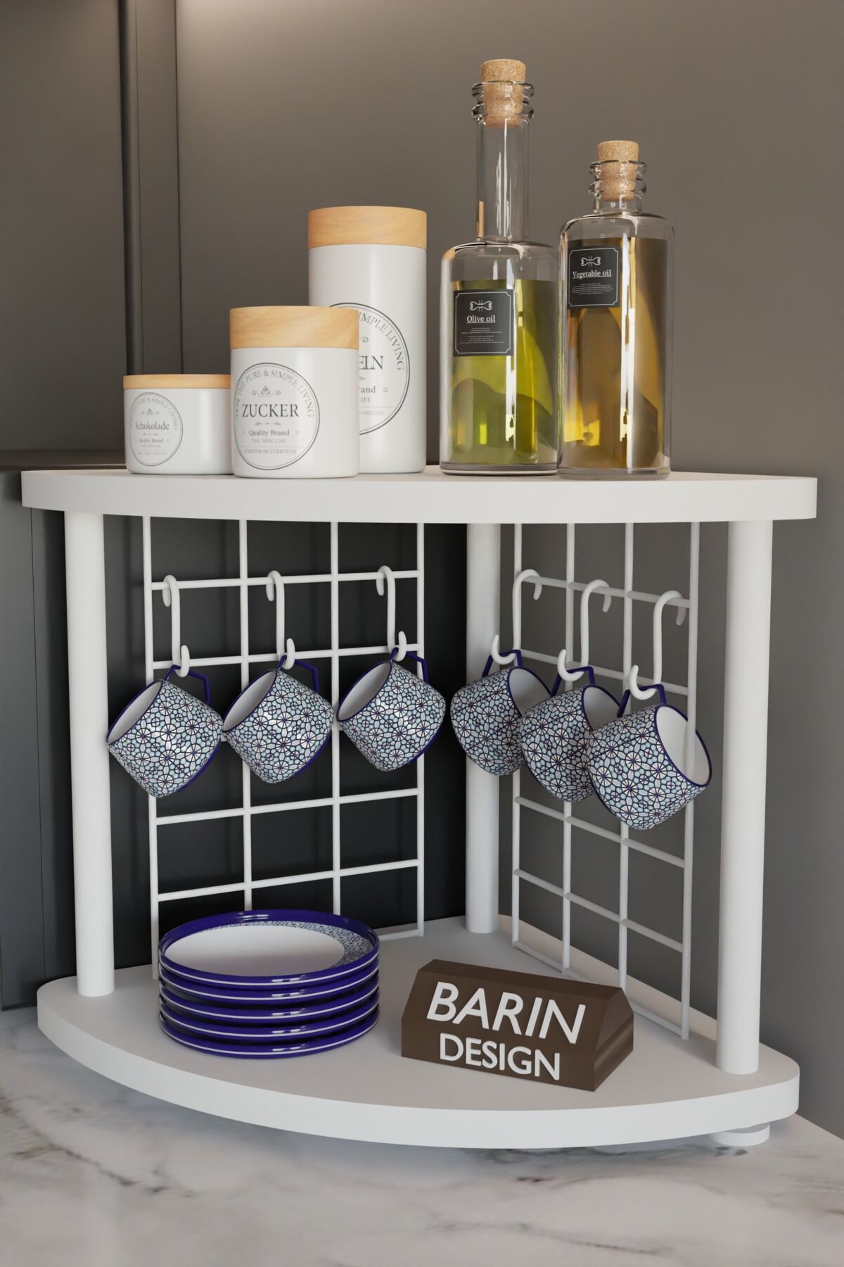 BARIN DESİGN Metal Tellİ Kahve Köşesi Raf – Çok Amaçlı Mutfak Standı, Mutfak Rafı, Tezgah Üstü Düzenleyici, Fincan Askılı, Çift Katlı, Şık ve Pratik Tasarım