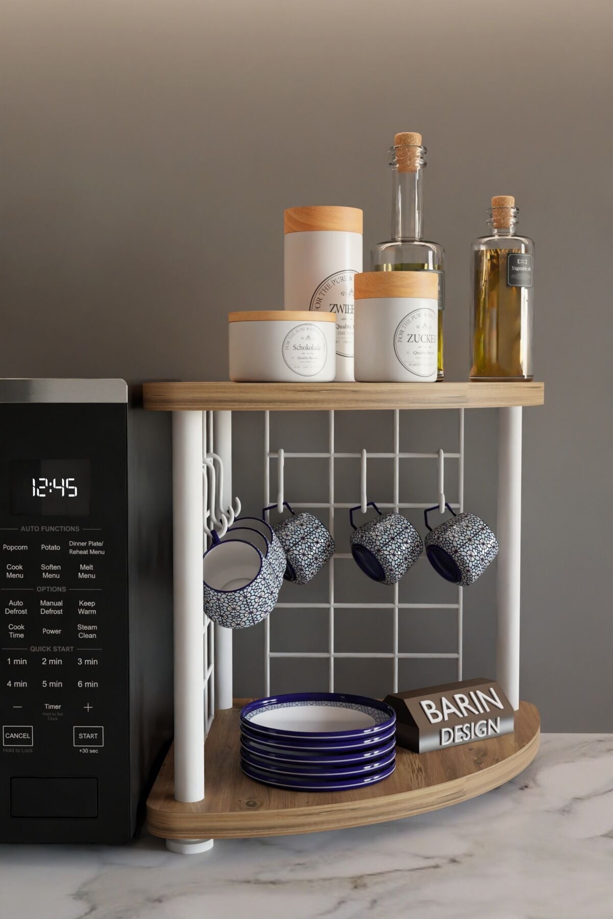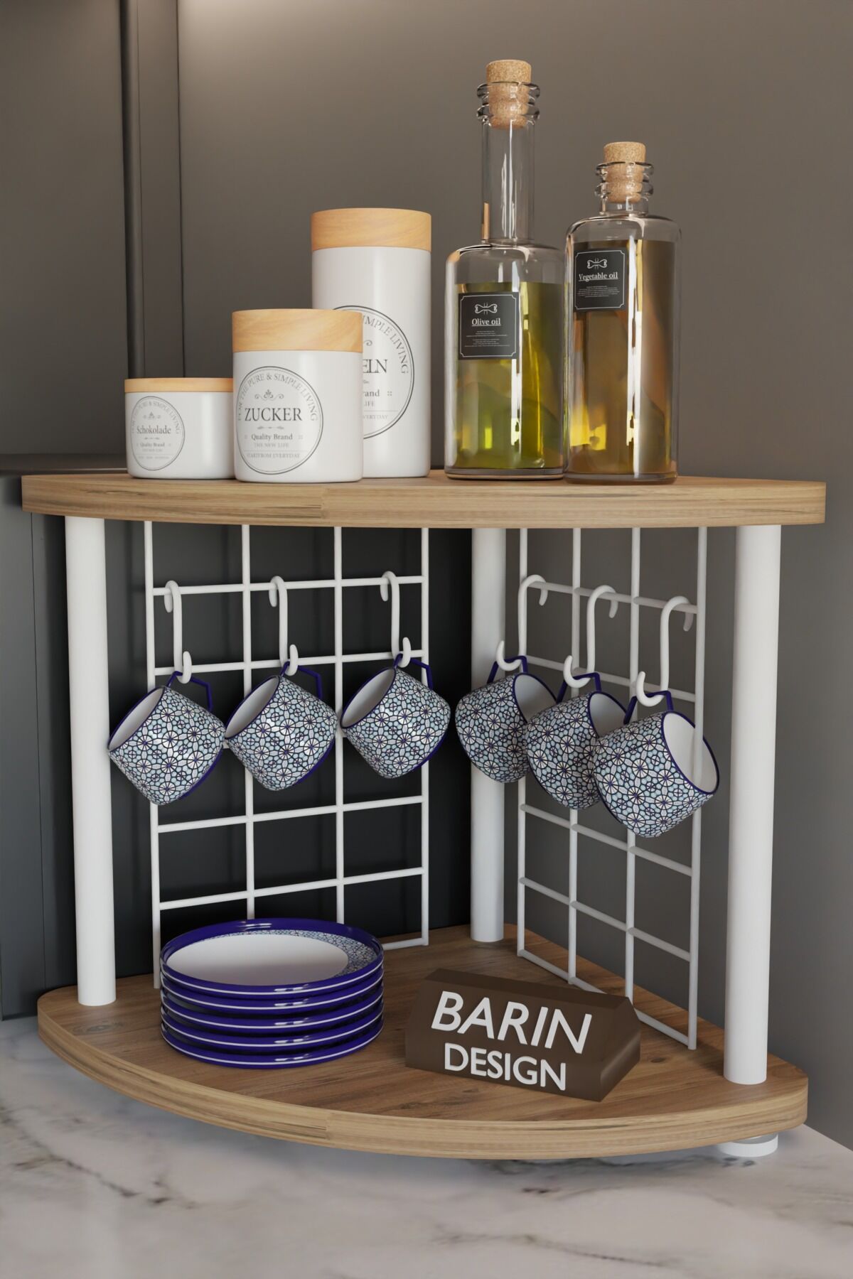 BARIN DESİGN Metal Tellİ Kahve Köşesi Raf – Çok Amaçlı Mutfak Standı, Mutfak Rafı, Tezgah Üstü Düzenleyici, Fincan Askılı, Çift Katlı, Şık ve Pratik Tasarım
