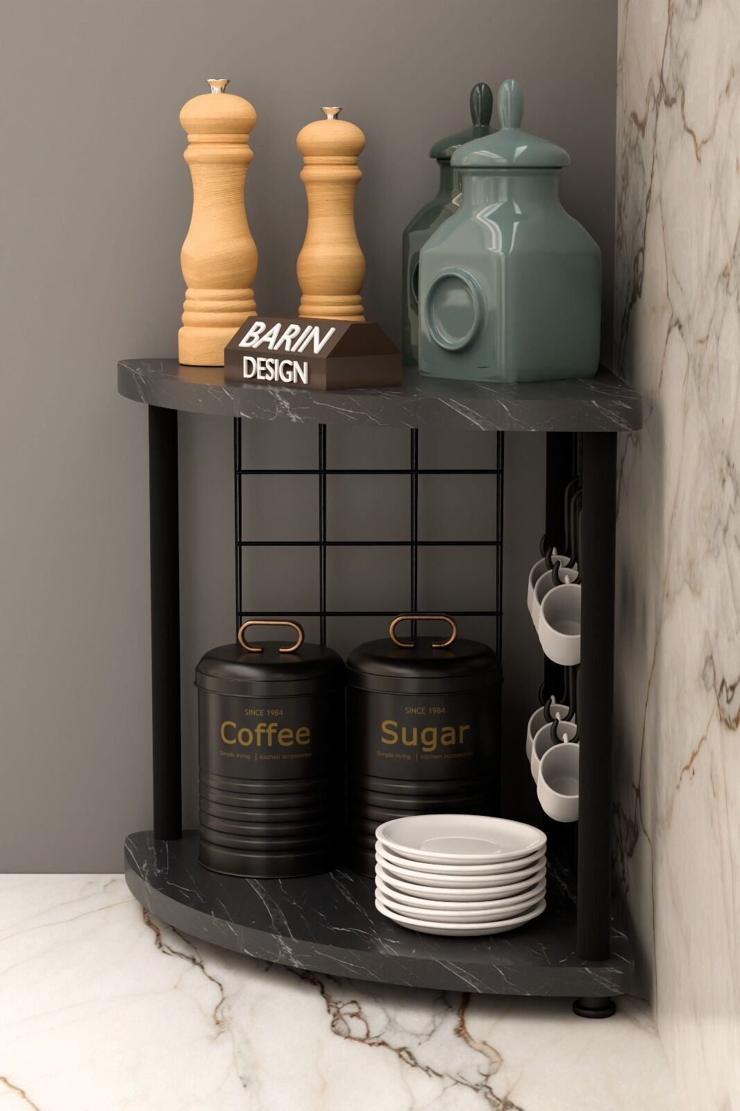 Metal Telli Kahve Köşesi Çevirtak Çok Amaçlı Mutfak Standı Tezgah Üstü Düzenleyici Çift Katlı Askılı Siyah Mermer