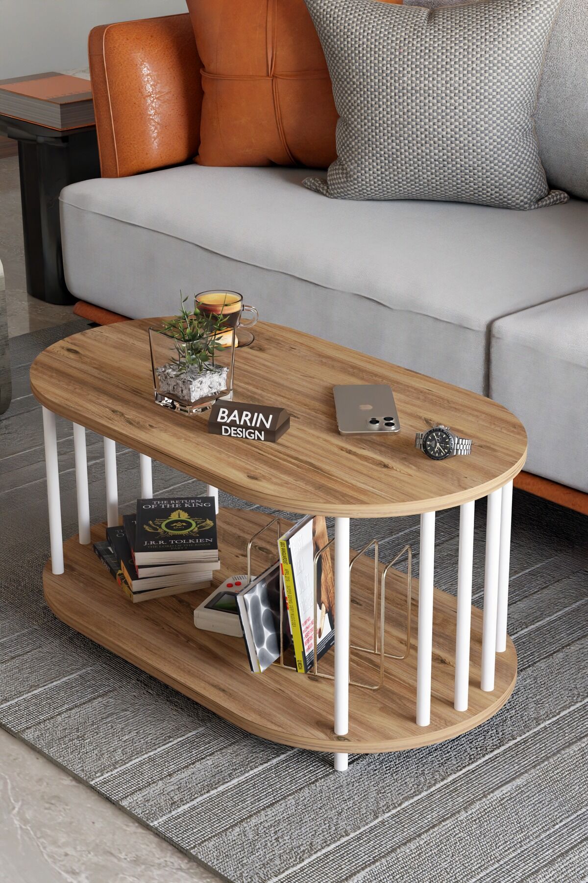 Modern Oval Orta Sehpa Çift Katlı Metal Ayaklı Salon, Ofis, Dekoratif Sehpa, Beyaz Demir Atlantik Çam