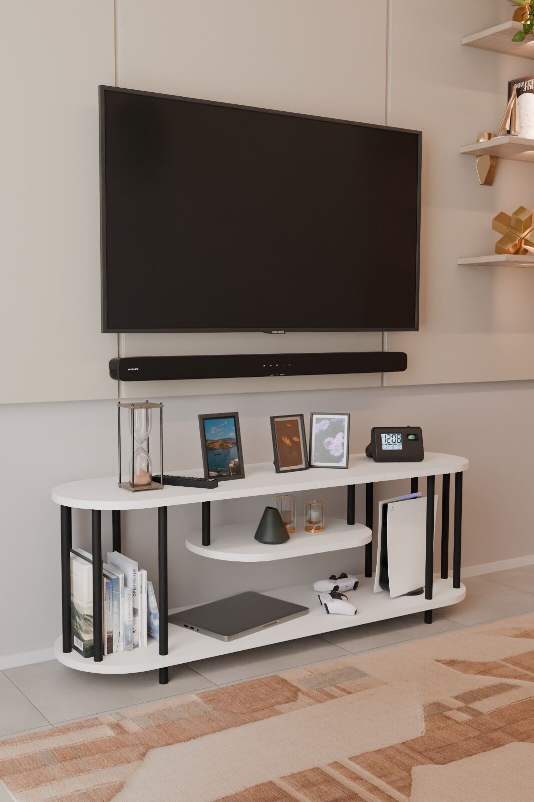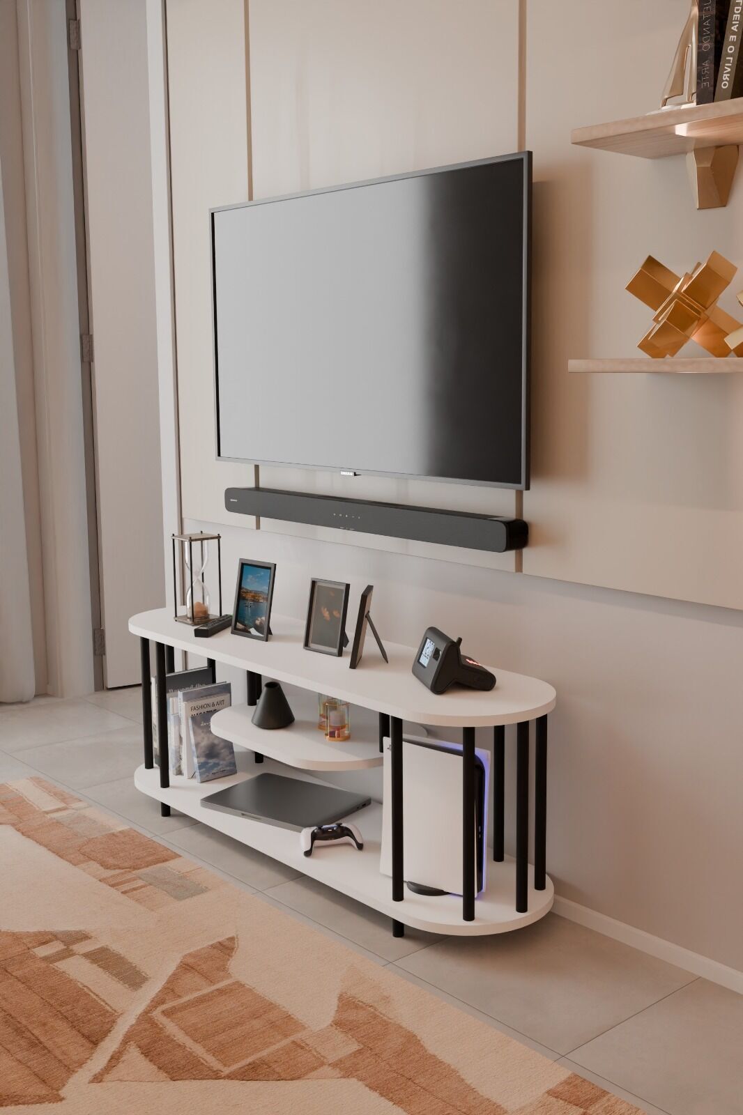 Modern TV Ünitesi Ahşap Raflı 2 Katlı Televizyon Sehpası Minimalist,Dayanıklı, Fonksiyonel TV Standı Beyaz
